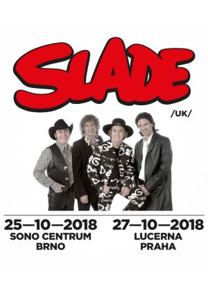 Slade, bezpochyby jedna z nejznámějších britských kapel, se v příštím roce vrátí do Česka! Ve čtvrtek 25.10.2018 v brněnském Sonocentru, které vyniká skvělým ozvučením a akustikou, a v sobotu 27.10.2018 ve Velkém sále Lucerny v Praze potěší a pobaví své zdejší fanoušky svou klasickou směsí pop-rock'n'rollu. Slade si vydobyli popularitu po celém světě, o čemž svědčí i fakt, že 23 písní z jejich repertoáru se v čase svého vydání brázdilo hitparády Top 20 a šest z nich dokonce obsadilo příčky nejvyšší. Jejich písně "Cum On Feel The Noize" a "Coz I Luv You" jsou dodnes velmi hrané v rozhlasovém éteru i využívány v televizních reklamách.